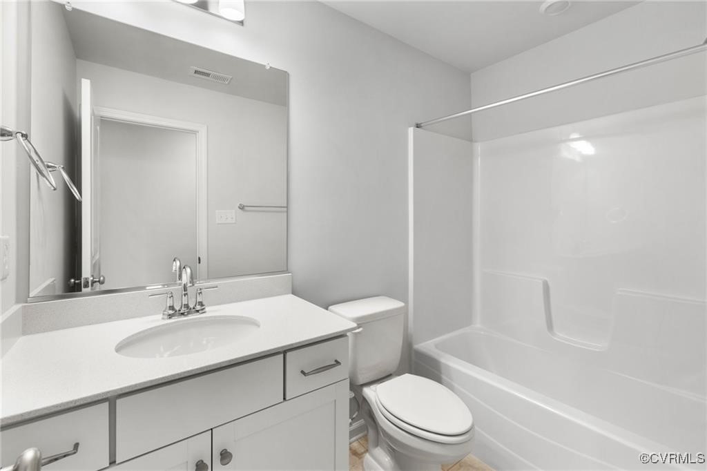 Upstairs, the primary bedroom impresses with a walk-in closet and an ensuite bath featuring dual vanities, a tile shower, ceramic tile flooring, and quartz countertops. Two additional bedrooms, a second full bath, and a laundry room complete the upper level, offering both comfort and practicality. Please note that some photos are renderings of the community.